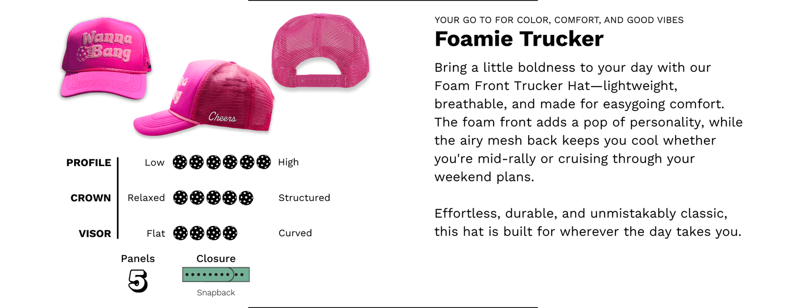 - High-Profile: High-height crown with a foam front panel to maintain hat shape.